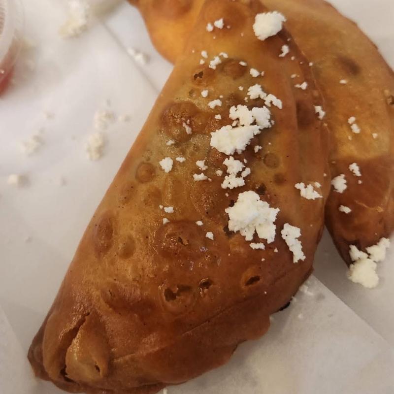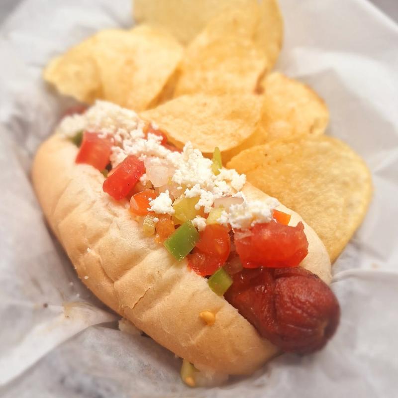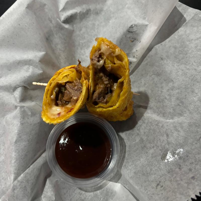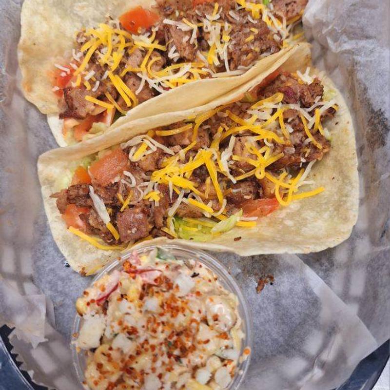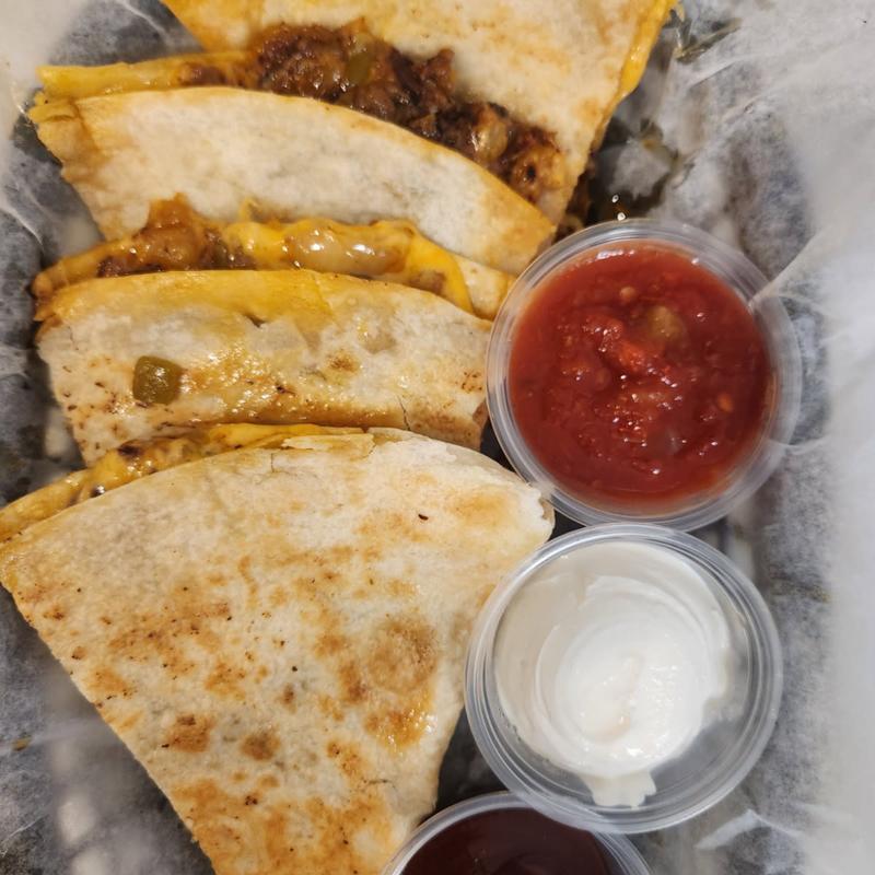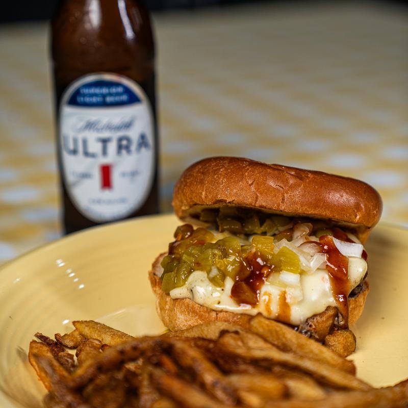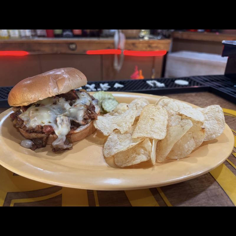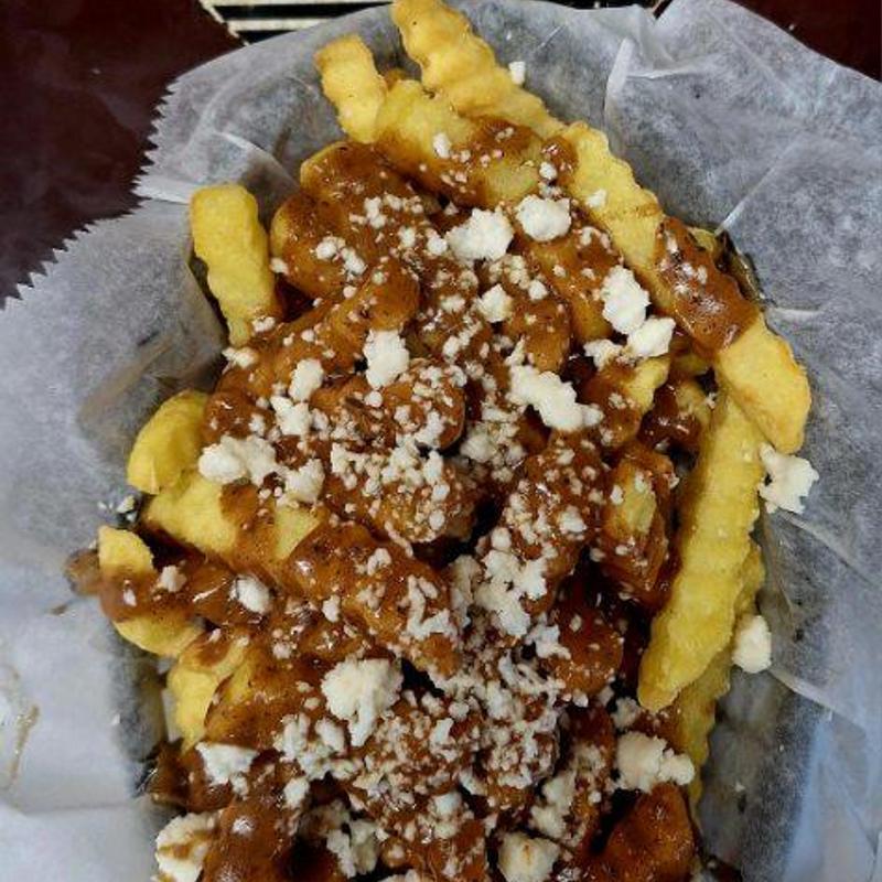 Basket of fries topped with brisket gravy, chopped brisket, green chiles, and onion