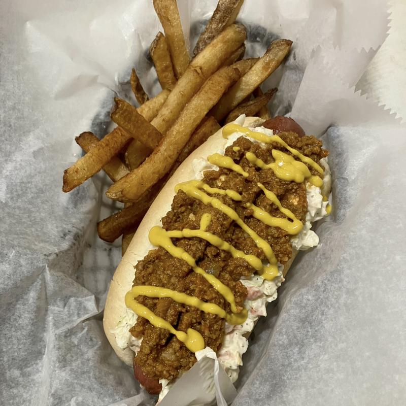 Basket of fries topped with chili, cheese, bacon, and sour cream